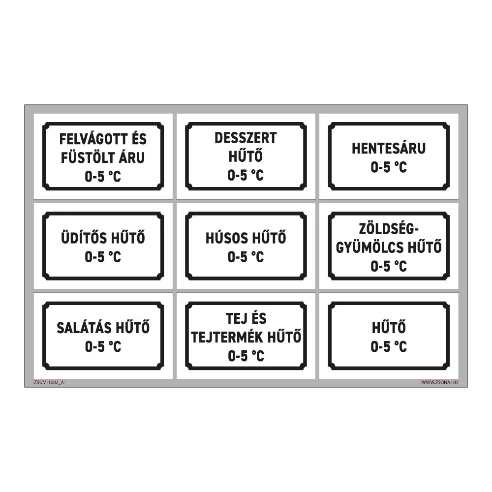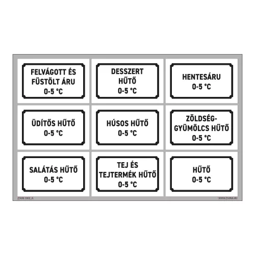 Oldószeres nyomtatóval nyomtatott vízálló matrica csomag. A/4 íven 18 db konturvágott matrica.Hűtőhőmérsékletek-felirat.A köjálos - HACCP - ÁNTSZ szabályozás szerintA matricákon a konyhákban kötelezően feltüntetendő jelöléseket tarrtalmazó matrica csomag..
