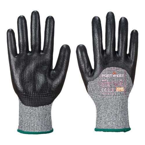 Magas vágásbiztosságot garantáló, olajos munkakörnyezetben is használható, habosított nitrillel bevont védőkesztyű.