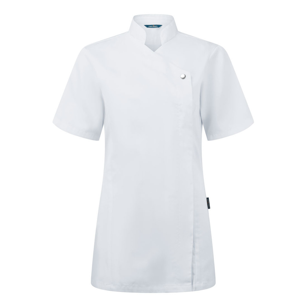 Ez a női tunika elöl patentos, rejtett cipzárral záródik. Az oldalsó sztreccs anyag használata a könnyű mozgás érdekében, valamint az oldalsó szellőzőnyílások és a fekete redő teszi ezt a ruhadarabot praktikussá, miközben megtartja a stílust.