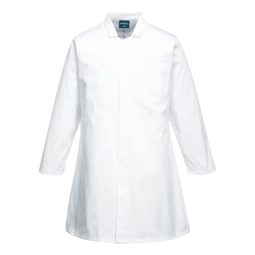 Élelmiszeripari kabát egy belső zsebbel a megfelelő tároláshoz. Tartós Kingsmill polipamutból készült.
